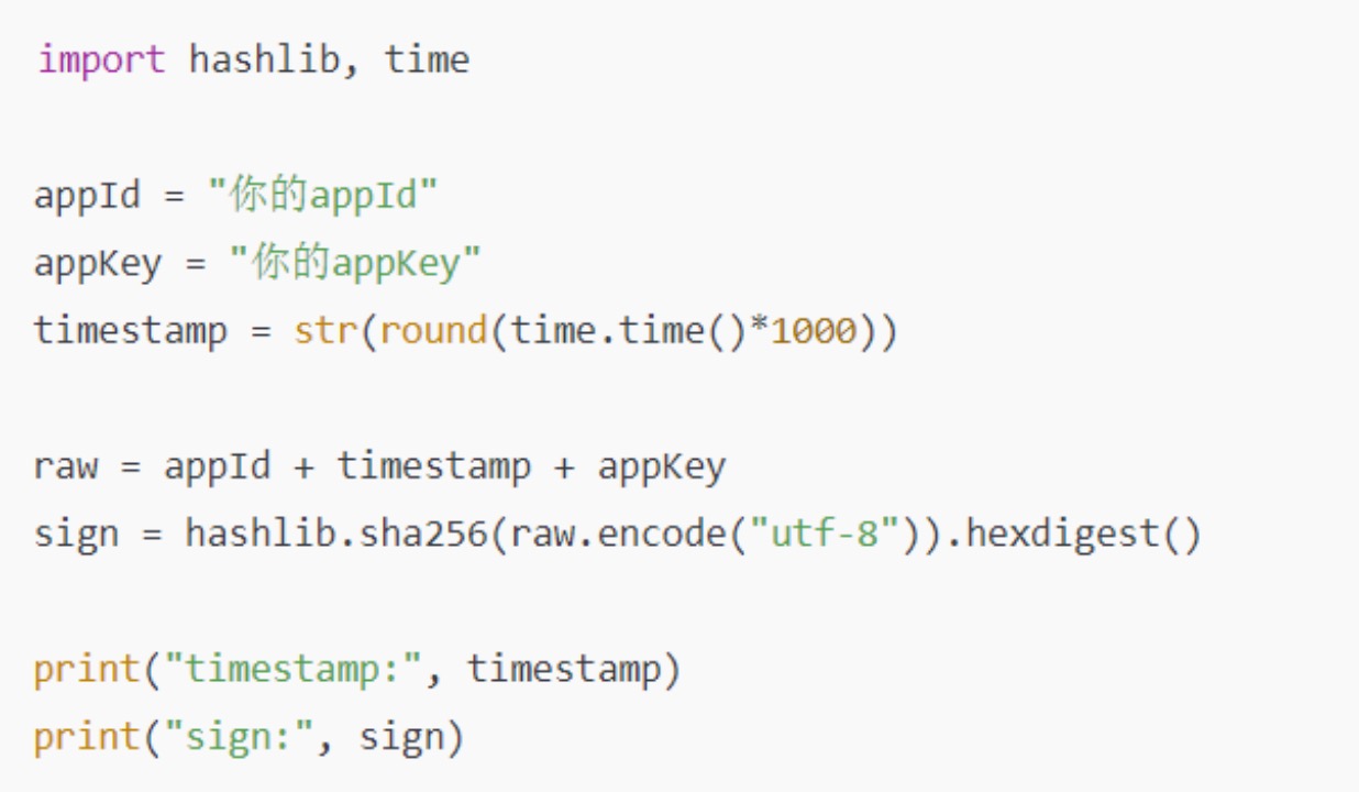 sign:签名字符串,用于校验请求是否合法。生成方式是将appId+timestamp+appKey按顺序拼接后,用SHA256算法进行哈希加密得到一段64位十六进制字符串。