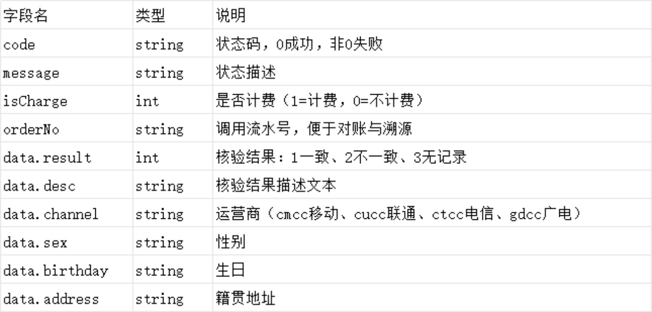 机三要素接口返回字段说明: