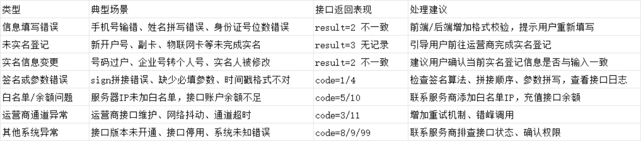 运营商允许手机号变更实名主体,例如号码过户、从企业户转为个人户等。如果用户使用的是曾经过户过的号码,但输入的仍是旧实名信息,也会返回“不一致”。此类问题在用户感知上很容易被误以为接口出错,实际上是运营商数据库中的实名人已经更新。