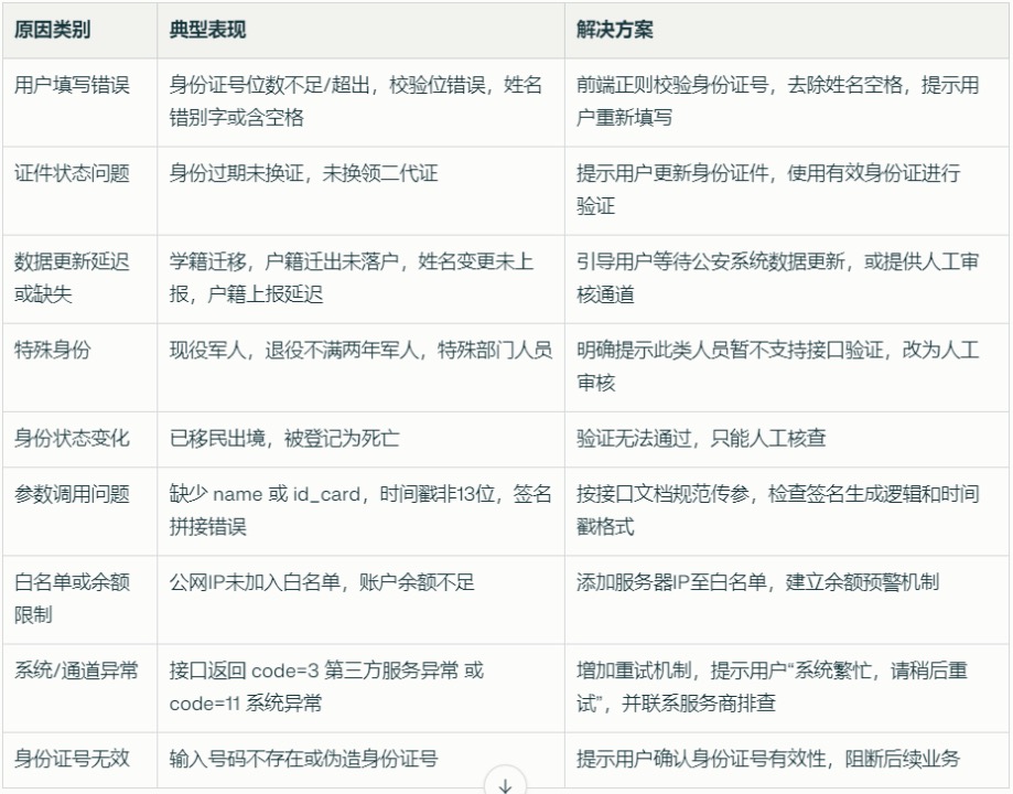 即使用户身份真实有效,也可能因为公安数据库更新延迟或身份状态特殊而导致验证不通过:
