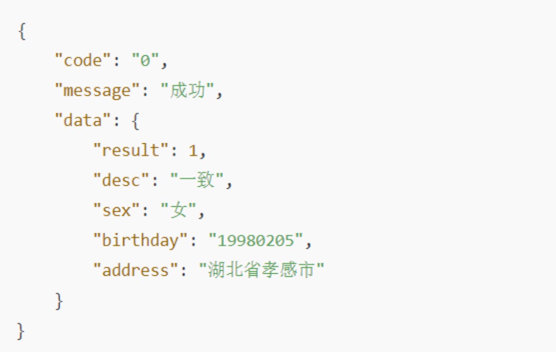 result=1代表一致;result=2代表不一致;code=0代表接口调用成功;