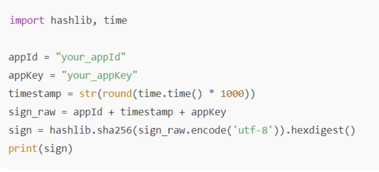 签名算法公式:sign=sha256(appId+timestamp+appKey)