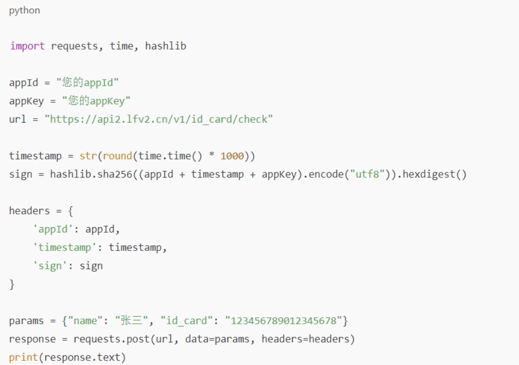使用时只需替换appId和appKey,并传入真实的name和id_card参数即可