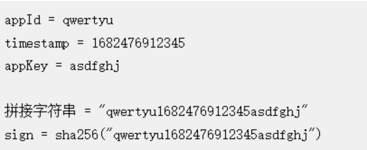 接口采用SHA256算法进行签名验证。签名计算分三步:获取当前时间的毫秒级时间戳(13位数字),按 appId + timestamp + appKey 顺序拼接字符串(无分隔符),对拼接字符串进行SHA256加密得到sign。