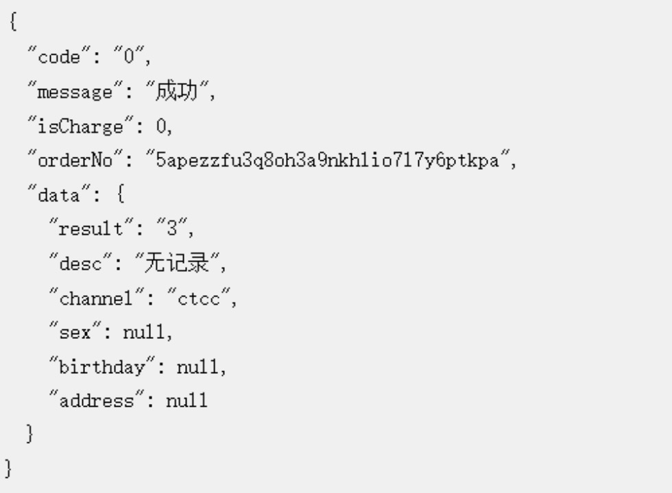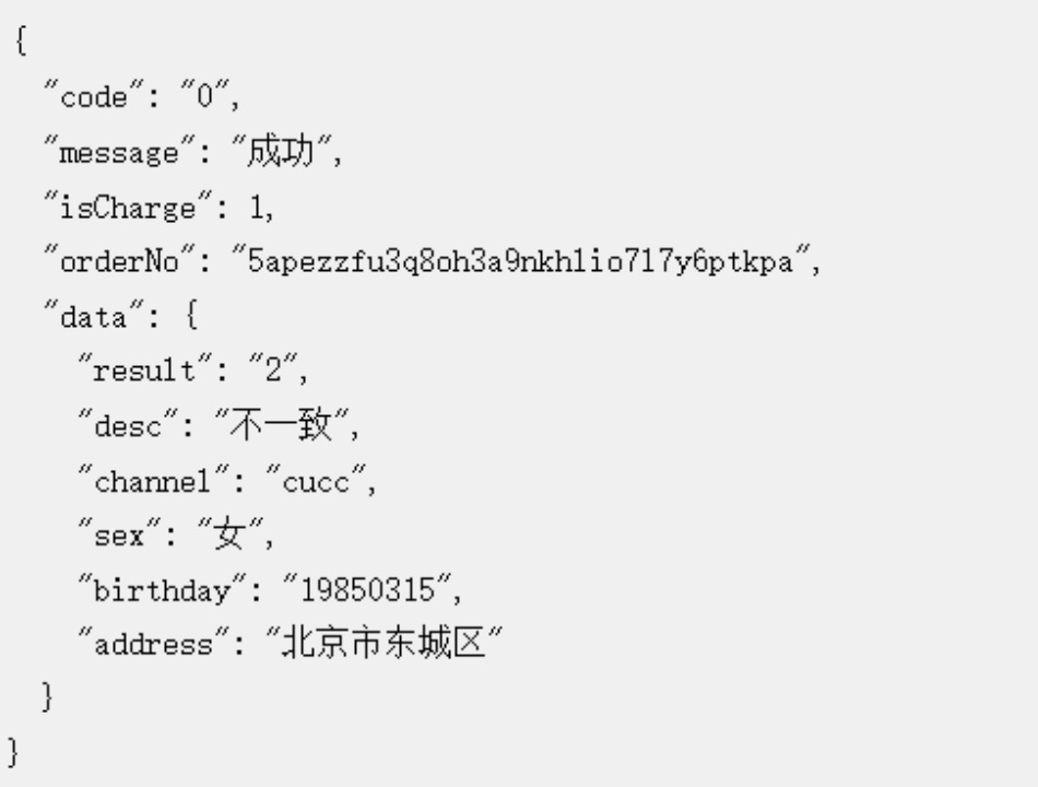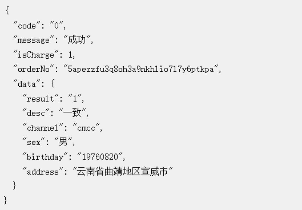 data对象包括:result(核验结果,"1"一致且计费,"2"不一致且计费,"3"无记录不计费)、desc(结果描述)、channel(运营商类型,cmcc移动、cucc联通、ctcc电信、gdcc广电)、sex、birthday、address(根据身份证号解析的附加信息)。