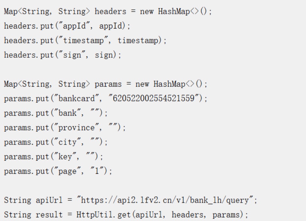 在完成签名生成后,即可构造联行号接口请求。请求头中放置 appId、timestamp 和 sign,查询参数中放置具体的银行信息。