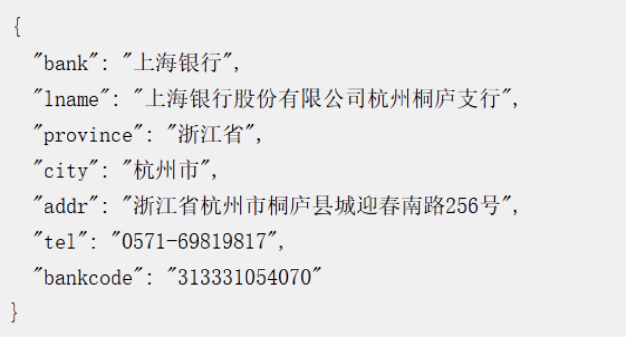 与业务直接相关的数据位于 data.record 数组中。record 数组中的每一项,表示一个匹配到的银行支行信息,其中 bankcode 字段即为该支行对应的联行号。
